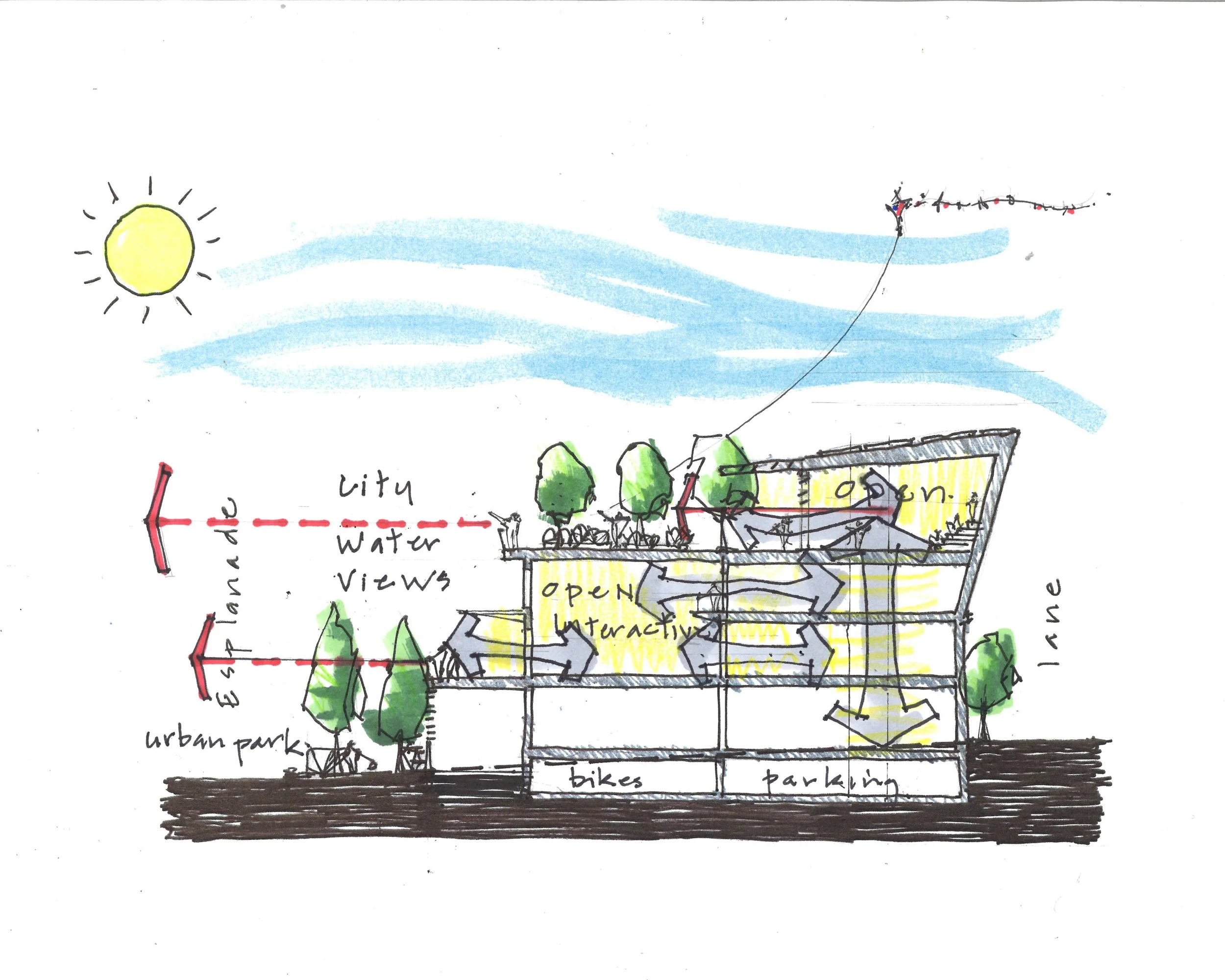 Moreover, the design thoughtfully engages with the contrasting characters of the two adjacent streets: one a bustling thoroughfare, the other a tranquil residential road. This duality is seamlessly integrated into the building's layout, ensuring it harmonizes with its surroundings while standing out as a landmark.
