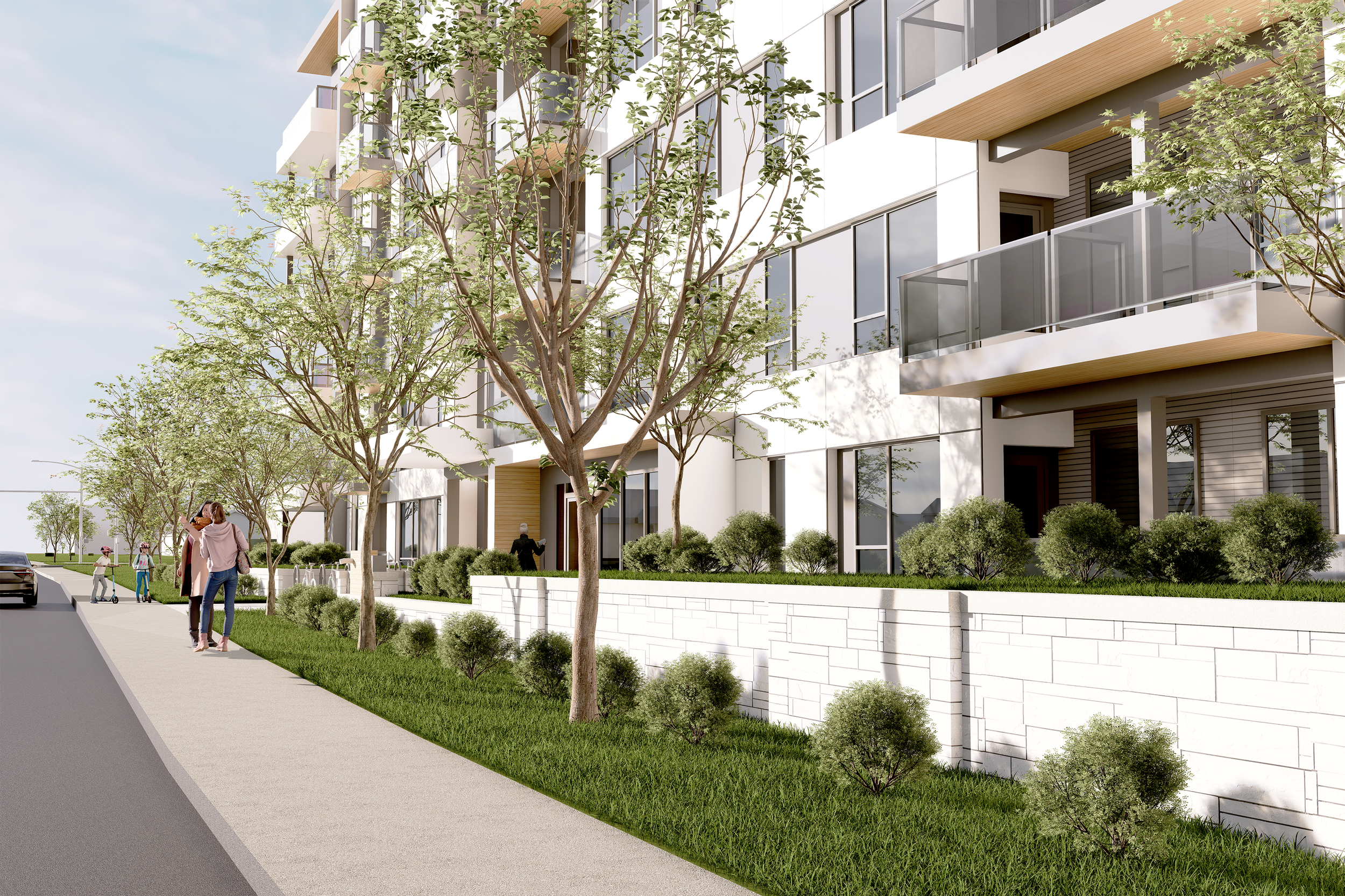 Architecturally, the building is articulated through a series of white frames that scale down toward the lane, paired with warm wood soffits and generous balconies. These elements break down the overall massing, bring rhythm and texture to the façades, and contribute to a more connected and human-scaled streetscape along Dewdney Trunk Road. Along the new south lane, ground-oriented units have a townhouse scale to transition comfortably to the neighbouring single-family houses.