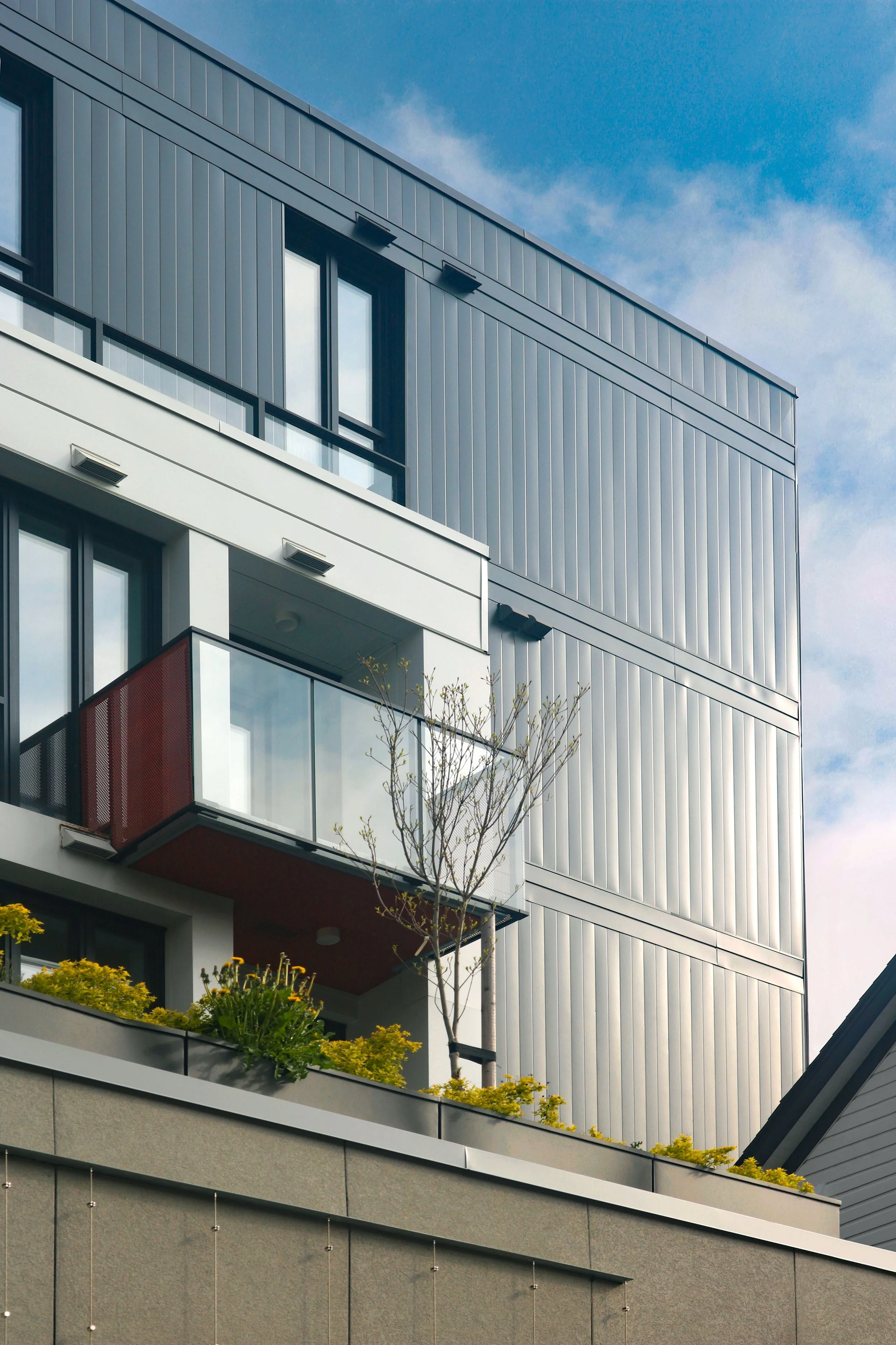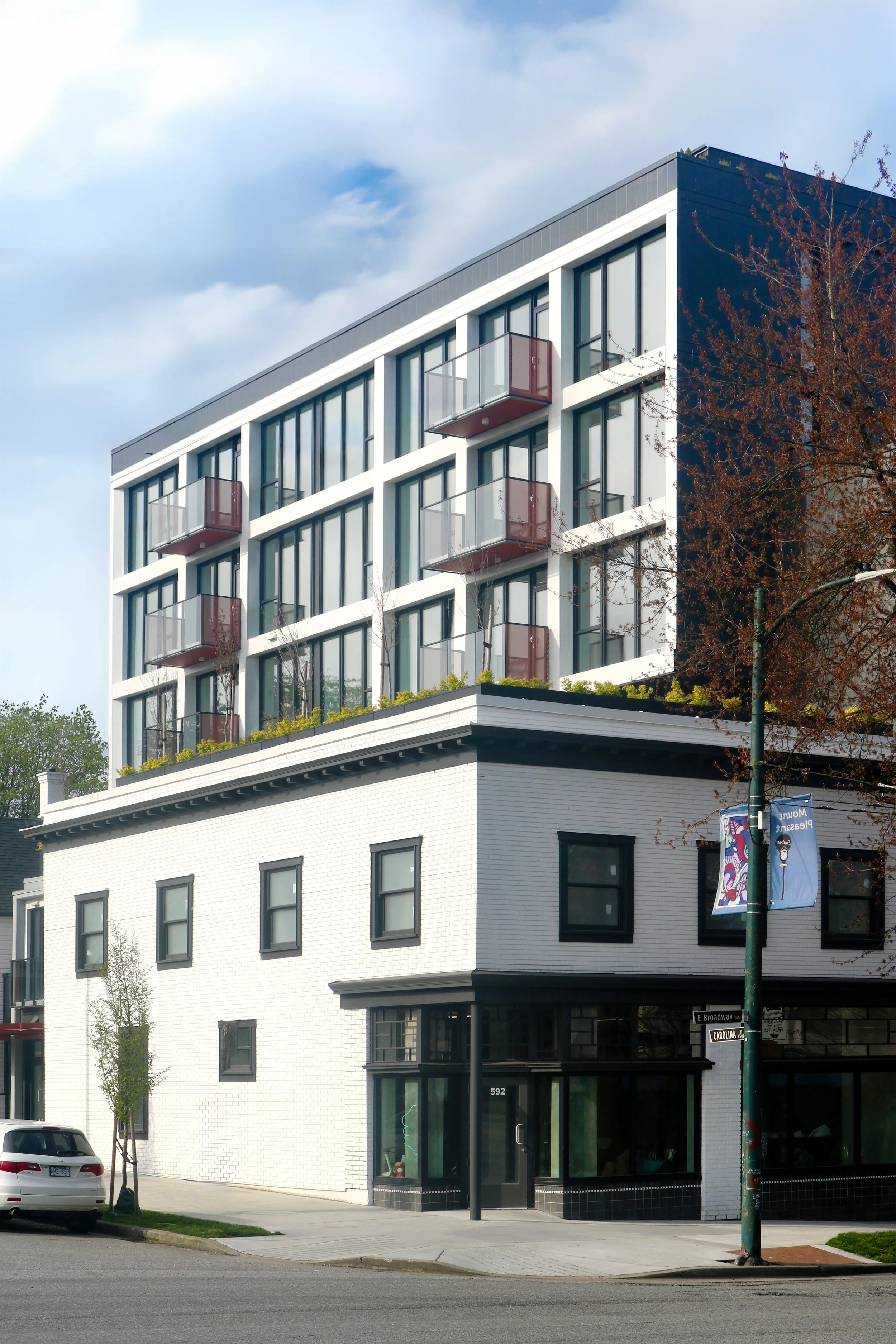 The project provides 65 rental residential units including two ground-floor oriented artist studios along Carolina, four commercial retail units, as well as generous amenity spaces including an extensive common deck on the roof of the Carolina and indoor amenity space with glazing off the lane.