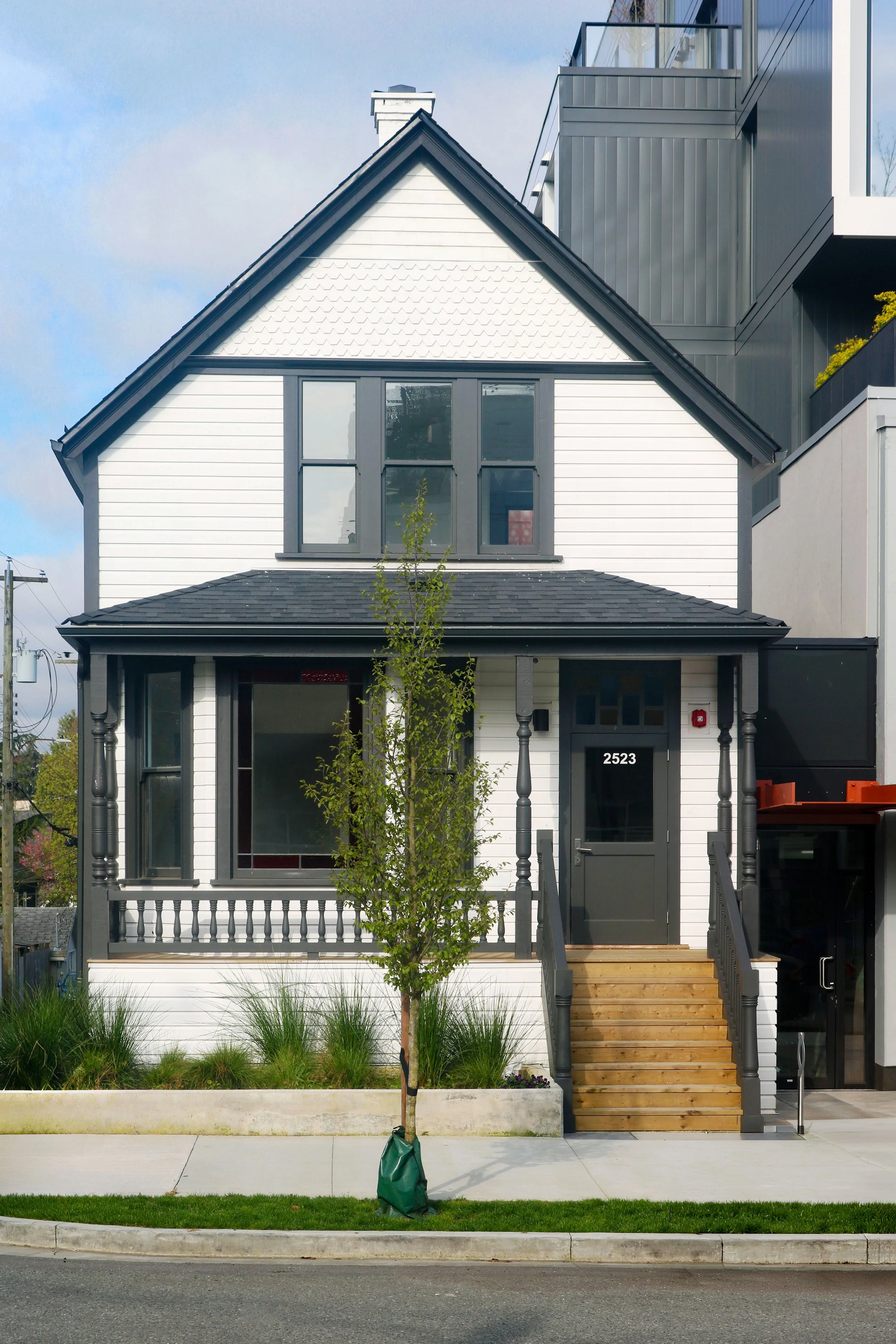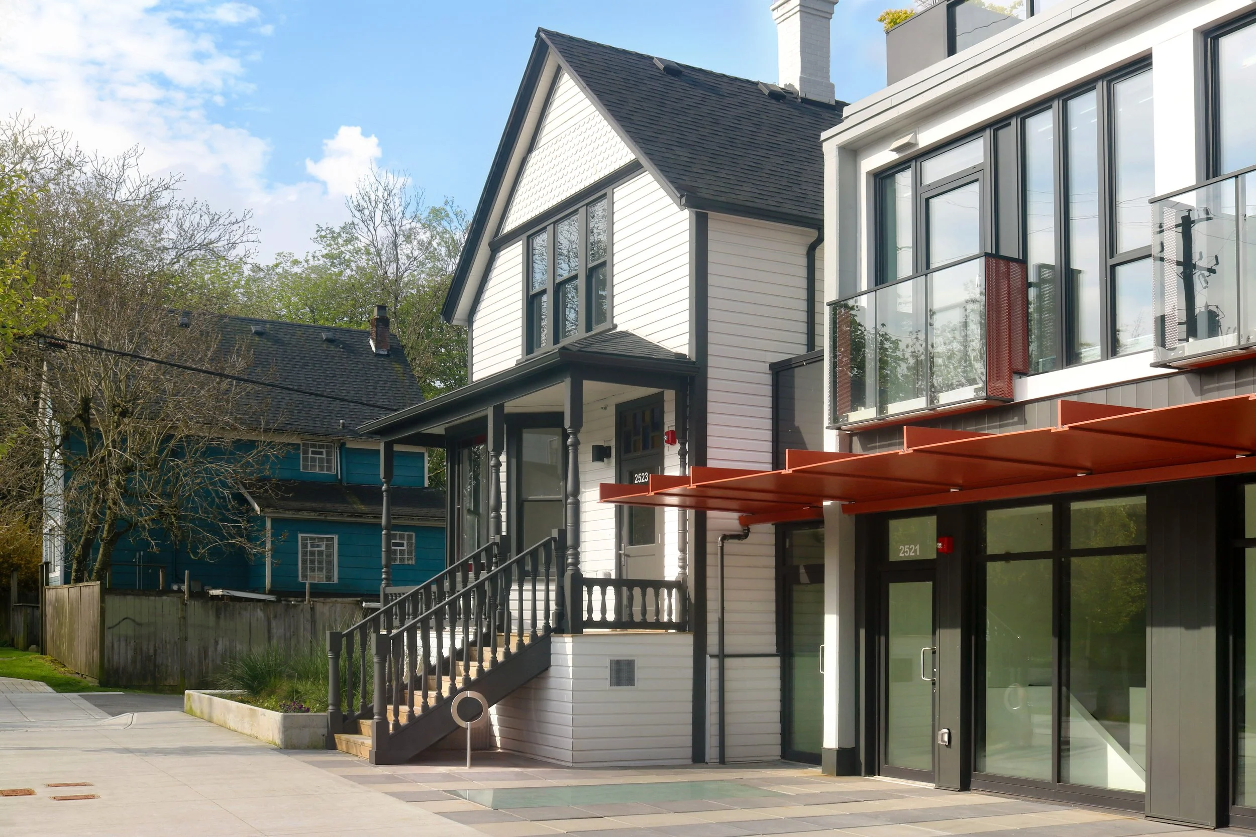 The architecture of the new building attempts to harmonize with its immediate context through a simple, responsive, and respectful massing: the six-storey form is broken into two smaller elements, then setback, rotated, and cantilevered in a simple, yet powerful gesture. The two elements are then articulated with cladding and glazing in similar arrangements but on opposite sides, further defining the initial gestures in a contemporary and minimal manner.