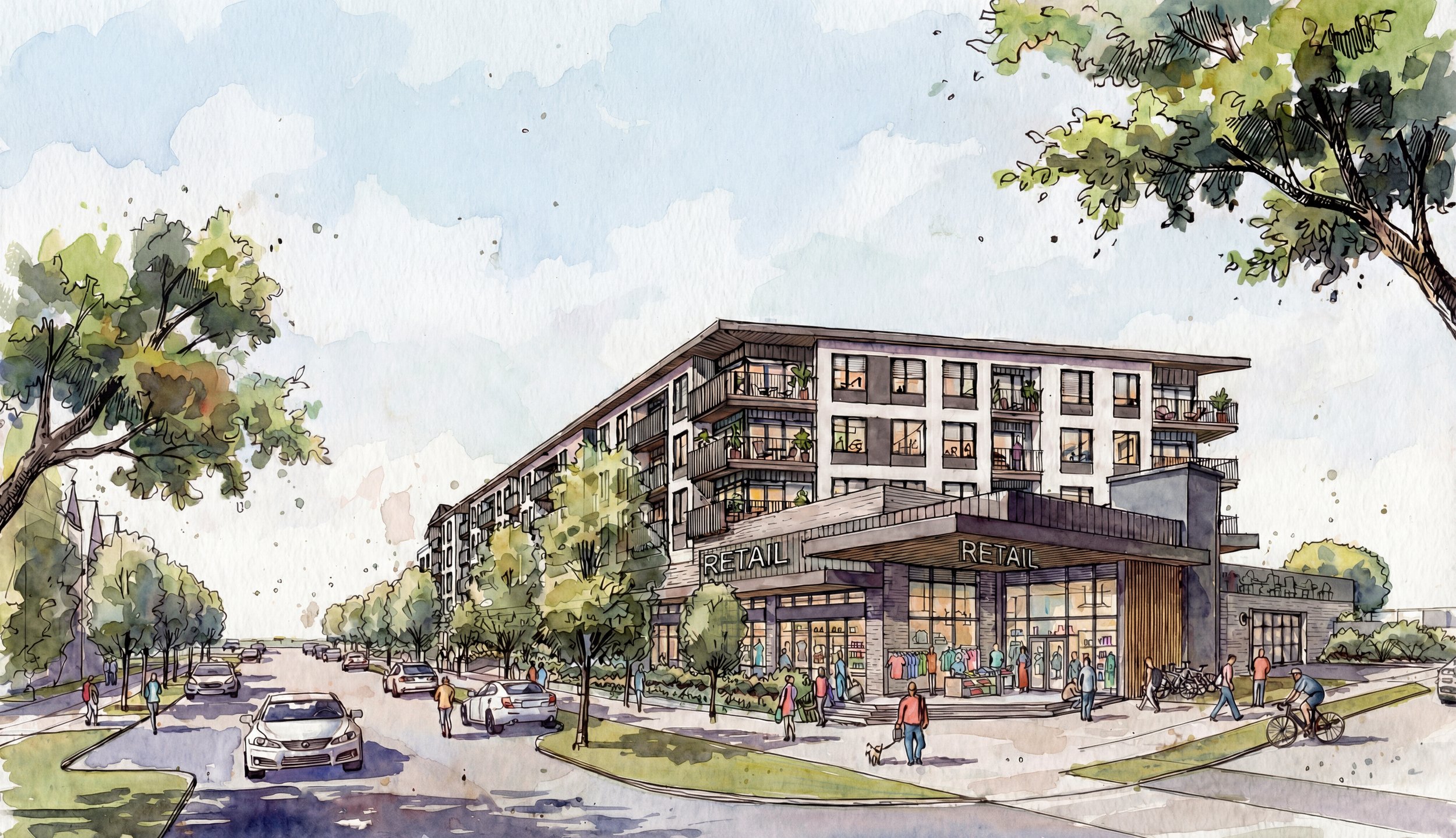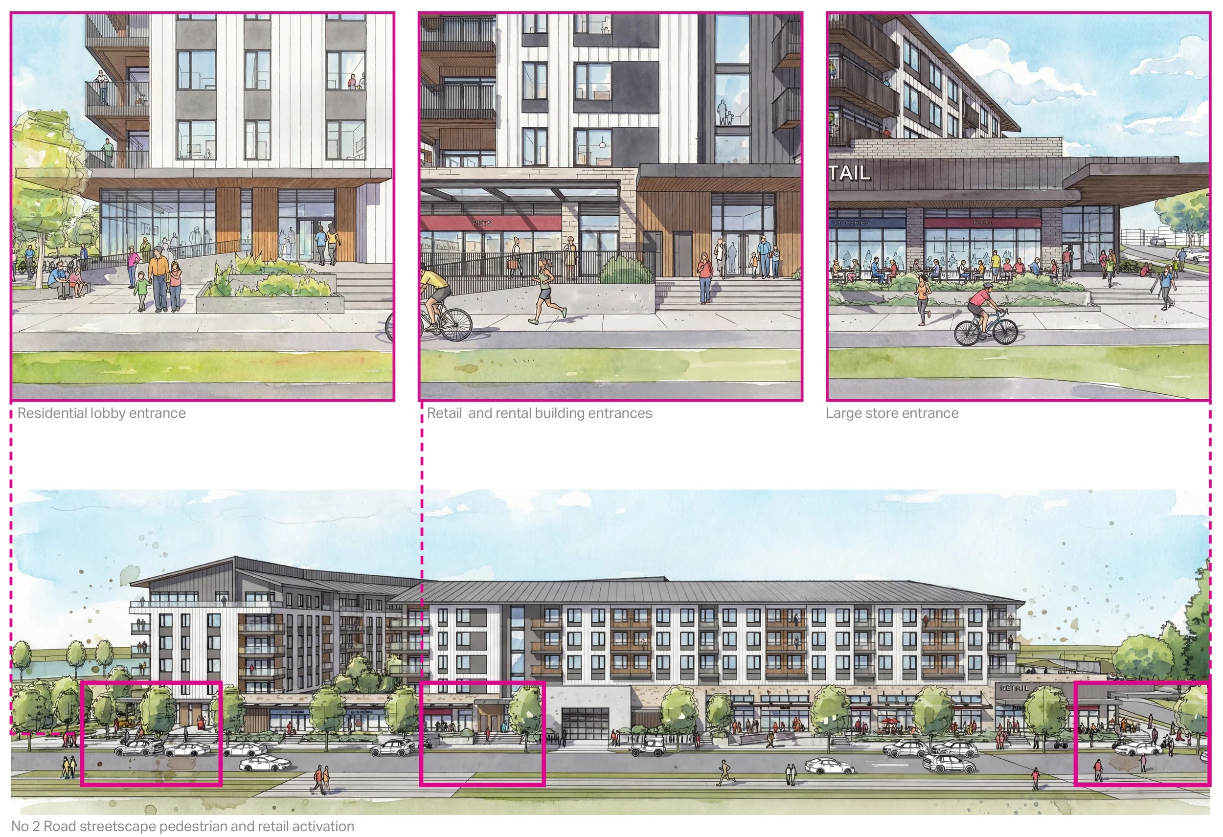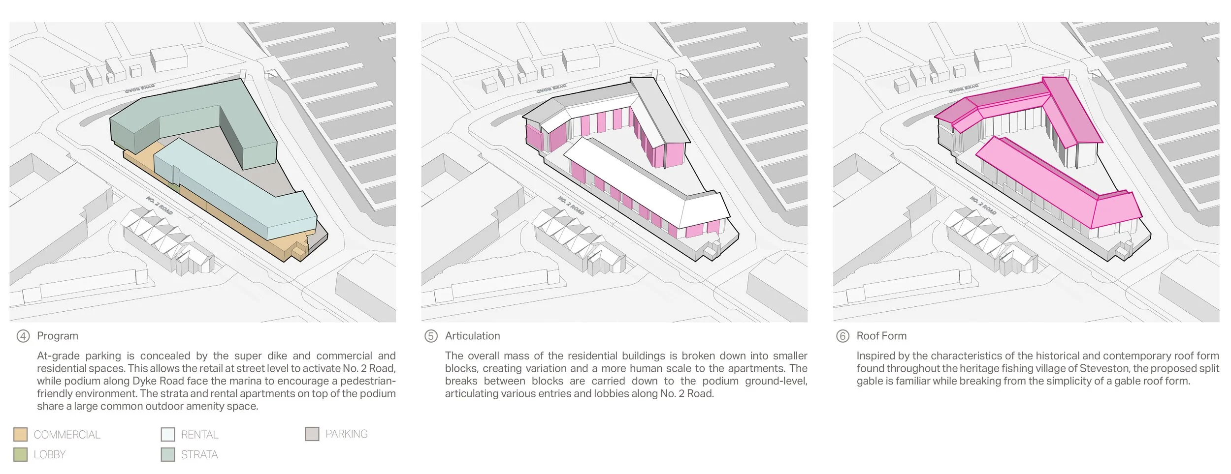The rezoning application for 12771 – 13131 No. 2 Road endeavors to enhance the character, density, and amenities of the neighborhood by developing a truly mixed-use community which includes over 200,000 SF (18,600 m2) of buildable area comprising strata apartments, market rental, and LEMR (Low-End of Market Rental) residential units, as well as various sizes of ground oriented commercial units. The proposed development consists of four-storeys of residential apartments placed over two levels of parking garage and organized in a pseudo-courtyard arrangement to optimize views to the water, solar access, and common amenities while maintaining privacy between units. The integration of the building onto the site required delicately navigating the restrictions of a riparian area along the south of the site, harmonization with the City of Richmond’s Dike Masterplan along the West, dedication of a new road along the North, crafting an appropriately scaled and pedestrian friendly ground floor interface along the East, and ultimately weaving together of all these elements into a cohesive site strategy.