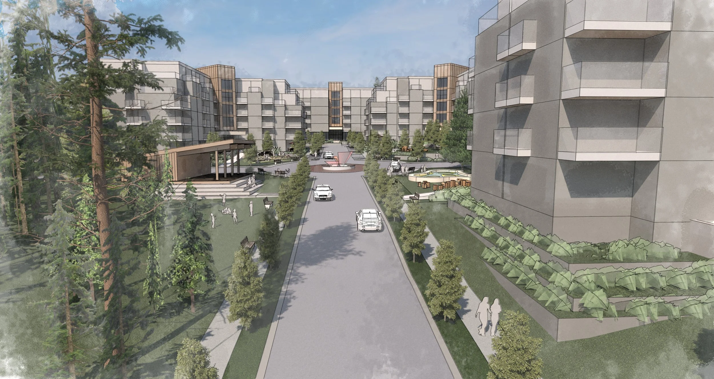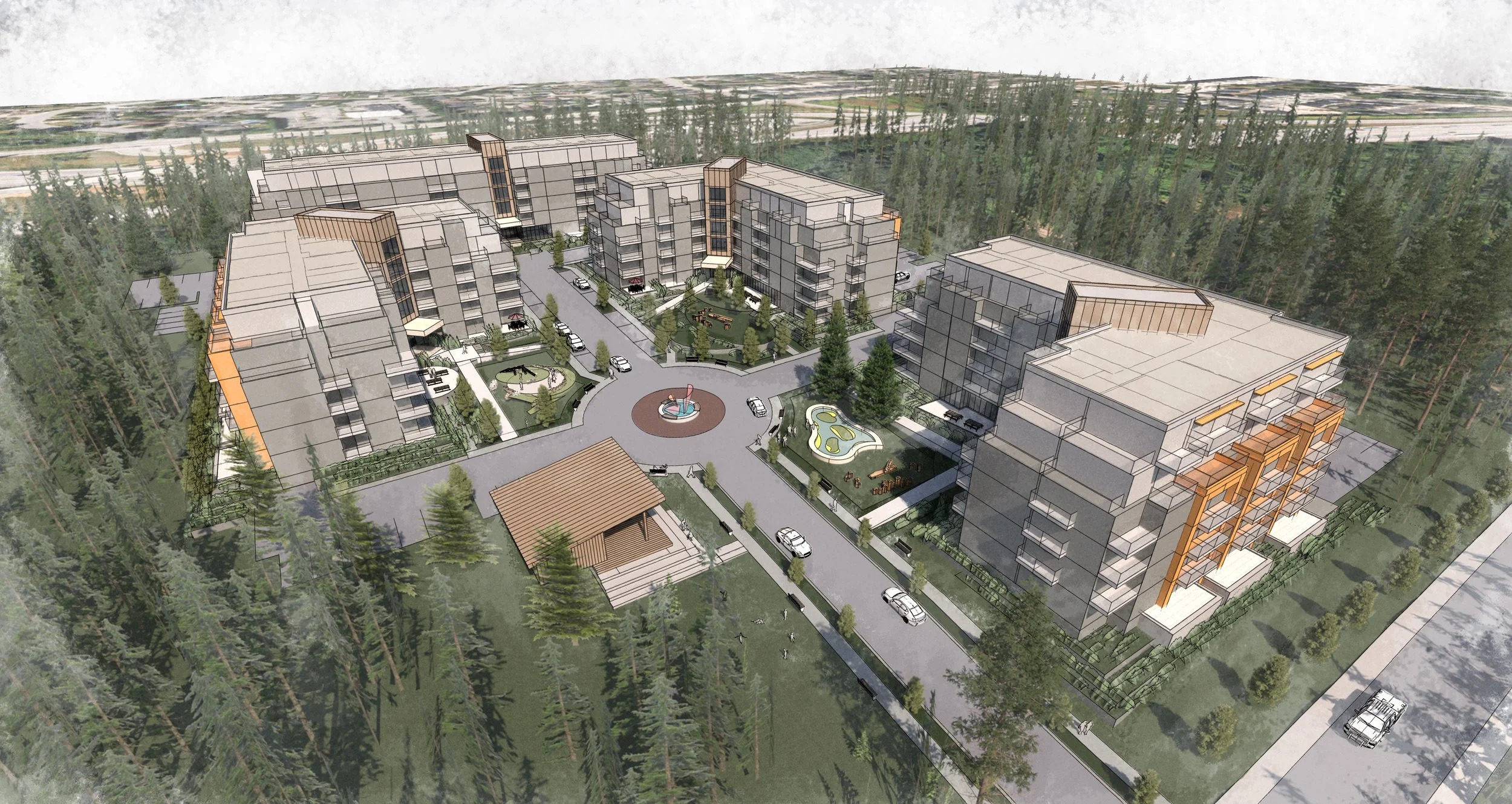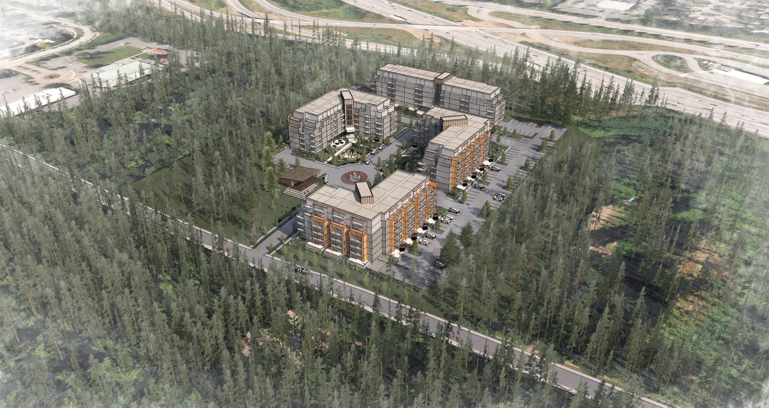 Formosis was retained to propose several possible scenarios to develop an approximately 323,000 sq ft site in south Surrey. The site is conveniently located near a Hwy 1 interchange and a major Regional Park. A grade separated pedestrian connection to the development was proposed to maximize the connection to this natural amenity.